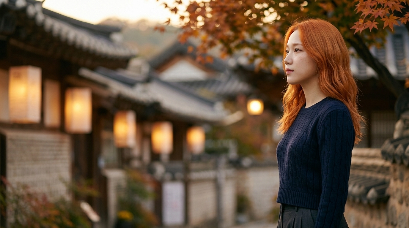 LEAD ROOM COMPOSITION — the subject is positioned on the RIGHT SIDE of the frame (her face on the right third line), looking and facing toward the LEFT side of the frame. The empty space (lead room) in the direction her gaze travels is generous — at least 55% of the frame lies to her left, blurred hanok village extending into empty space. Her face is in the right third, her eyes looking across the empty left portion. She has 'space to look into'. The composition feels natural and balanced, NOT cramped against the edge. Medium close-up framing.