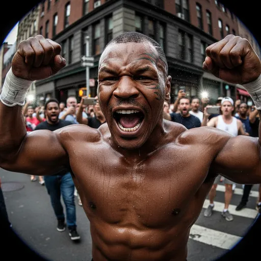 Legendary heavyweight boxer Mike Tyson, shaved head, iconic-style face pattern (non-identical), Yelling with fists raised in a spontaneous high-energy moment, Sweaty skin, intense expression, raw physical power; Yelling with fists raised in a spontaneous high-energy moment; Urban street corner with bystanders filming on smartphones, People reacting with shock and excitement, chaotic background, Candid, unplanned, viral atmosphere; Candid, unplanned, viral atmosphere, Dust in air, Phone flash reflections; Hyper-realistic amateur photo, Neutral outdoor tones, High contrast, slightly oversaturated; Amateur smartphone close-up, slightly tilted, Wide-angle phone lens with mild distortion, Subject sharp, background blurred with motion; Natural or street LED lighting, Overexposed highlights, lens flare, harsh shadows