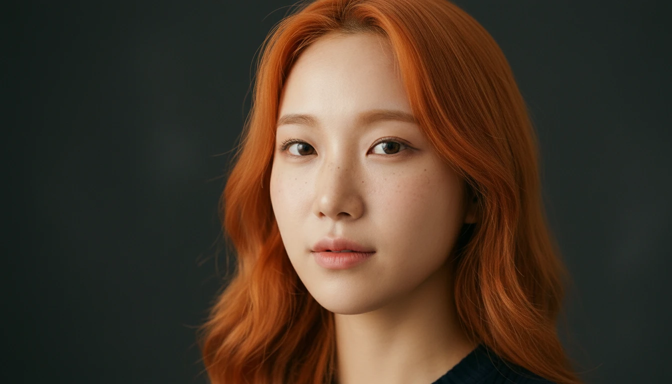 LOOP LIGHTING CLOSE-UP PORTRAIT — TIGHT HEAD-AND-SHOULDERS CROP, face fills 65% of the frame. A key light is positioned at 45 degrees horizontally and slightly above her eye line. This creates a distinct small LOOP-SHAPED NOSE SHADOW on her cheek — a narrow elongated shadow cast from her nose onto the cheek, but the shadow does NOT touch the shadow-side of her face (this is what separates loop from Rembrandt). The shadow forms a small clear 'loop' on one cheek. The other cheek is in gentle shadow. Background is dark and blurred. Close tight portrait framing — we only see her face and top of her shoulders.