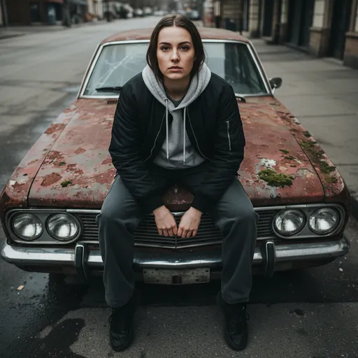 A low-angle, full-body cinematic portrait., A young woman (face identical to the reference photo).; Shot from a low perspective that makes the viewer look up at him.,; Sitting directly on the hood of an old, rusty car., Gazes directly into the camera., Serious, intense expression.; A low-angle, full-body cinematic portrait., A young woman (face identical to the reference photo)., oxidized surface of the car hood, above the windsh; the collar subtly visible beneath the jacket., Loose-fitting dark gray trousers., Dark sneakers., Low-angle, full-body.; Rest on his knees or are clasped loosely in his lap., Slightly apart, with his feet visible on the damp, A black or charcoal zip-up or bomber jacket., Layered over a light gray hoodie