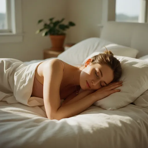 Lying on left side, arms crossed under chin slightly, showing shoulders and upper arms clearly, relaxed and natural body posture, cozy and soft sensual vibe, Loosely draped white bed sheet, showing a hint of muted pink spaghetti strap top underneath ๐๐, Not specified, Jewelry as described above; Lying on left side, arms crossed under chin slightly, showing shoulders and upper arms clearly, relaxed and natural body posture, cozy and soft sensual vibe; On a bed with white sheets, sunlight coming through a window, soft warm natural light, Morning, Bed with white sheets, Cozy bedroom setting ๐๏ธ, Soft, warm, dreamy light with gentle contrast on face...; Soft, dreamy, warm natural light, gentle and sensual; Hyper-realistic portrait, cozy editorial, Natural sunlight photography, Soft, dreamy, warm natural light, gentle and sensual, Warm sunlight streaming; 1:1; Warm sunlight streaming through a window, creating beautiful highlights and soft shadows on face and shoulders ๐๐, Enhanced warm natural sunlight for soft and dreamy appearance