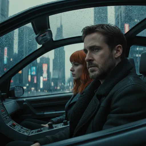 A medium close-up cinematic still from the movie 'Blade Runner 2049'. Inside a futuristic vehicle, a man and a woman are seated. The man, Ryan Gosling as Officer K, is in the driver's seat in the foreground, wearing a dark, heavy, shearling-lined coat. He has a beard and looks pensively to the si...; Futuristic Car Interior, Rainy, overcast outdoors visible through the window; Contemplative, melancholic, futuristic; Cinematic Still; Eye-level; Soft, diffused, natural daylight from outside