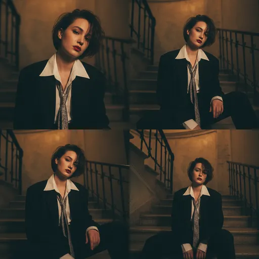 A moody, cinematic 2x2 collage featuring the same young woman, Short, tousled, Bold red lipstick, Striking; A moody, cinematic 2x2 collage featuring the same young woman, Short, tousled, Bold red lipstick, Striking, f/1.8, 400, 1/160s, Moody editorial collag; androgynous editorial look, Oversized black suit, Loose white dress shirt with an open collar; Close-up from a lower angle,; Patterned tie hanging untied around her neck, Old stairway in a dimly lit interior, Warm, amber-toned lighting, Worn black railings, Textured walls, Soft ambient glow, Sitting on the steps, leaning fo