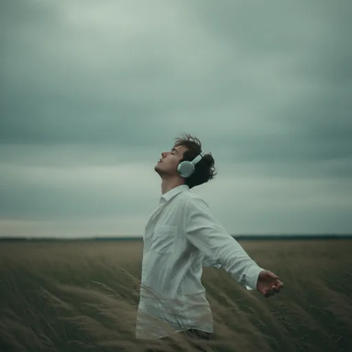 "moody cinematic portrait, lone young man in tall grass field at dusk, overcast sky, teal-green color grade; wearing white buttoned shirt, matte silver over-ear headphones, side profile, head tilted back toward sky, eyes closed; "moody cinematic portrait, lone young man in tall grass field at dusk, overcast sky, teal-green color grade; shallow depth of field with creamy bokeh, natural ambient light, soft rim light on hair, melancholic freedom vibe; arms open and slightly back, wind-swept grass blades in foreground creating soft motion blur, minimal contrast, subtle grain”