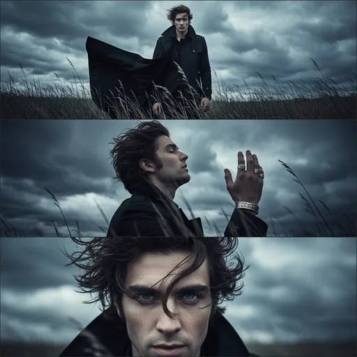 A moody triptych of a man (use silver rings and bracelet in his hand, and wild wi; Bottom panel: Close-up of his face, sharp attractive eyes, hairs moving in the wind.; Top panel: Direct gaze, standing in tall dark grass, sky overcast, dramatic contrast, coat fluttering., Middle panel: Profile view, looking up at the cloudy sky, hair blowing dramatically, grass parti