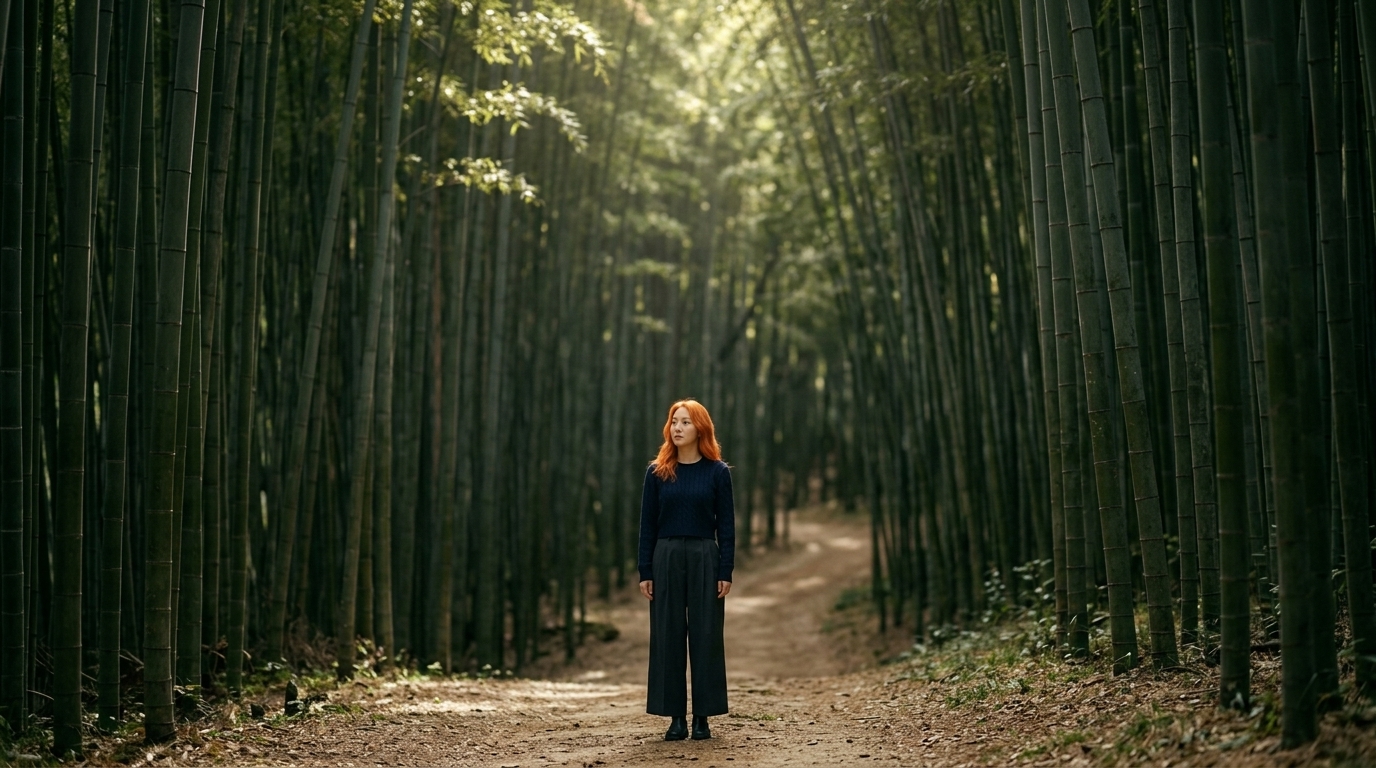 NEGATIVE SPACE — the subject is small in the bottom-third of the frame. The vast bamboo forest stretches above and around the subject with empty atmospheric space. Zen, peaceful, contemplative. Solitary in nature.