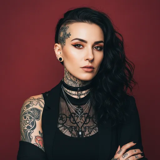 No plastic smoothness., Her neck features layered ornamental motifs., Accessories include layered black chokers, thin chains, small black earrings, and subtle piercings.; Her makeup is sharp but realistic: defined brows, warm smokey eyes, clean eyeliner, and matte pink lips., Her gaze is piercing and dominant.; Background: A deep red studio backdrop, matte and slightly textured.; Mood & Imperfections: Realistic, powerful, alternative, stylish.; A bold, alternative-style young woman in her mid-20s with a powerful, confident attitude., She has a half-shaved undercut hairstyle: one side closely; Camera & Technical: Full-frame camera with a 50mm or 85mm lens at f/2.2., Wider composition to keep both elbows fully inside the frame.; Her skin is light-medium with a natural matte finish, showing realistic skin texture, subtle pores, faint micro-imperfections, and soft natural highlights., Her upper body and arms are covered in deta