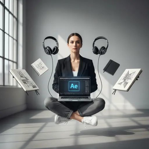 over-ear headphones, Moleskine notebooks, open sketchbooks with visible sketches, and Adobe After Effects (Ae)., Emphasize: completely realistic levitation (no visible support), flawless symmetrical arrangement of floating objects; Replace the face with the uploaded person’s face while keeping the exact same body pose, outfit, and styling., The subject wears a tailored modern black blazer, grey trousers, and clean white sneakers; A cinematic levitation portrait of a woman sitting midair while working on a laptop., Surround the subject with symmetrically floating creative tools:; Style: ultra-sharp, hyper-realistic composite photography, high-end digital retouching, shallow depth of field (soft bokeh background), perfectly clean minimal background.; The scene is set in a minimal studio room with soft natural light pouring in from large floor-to-ceiling windows, casting long, directional shadows across the space., and glowing professional software