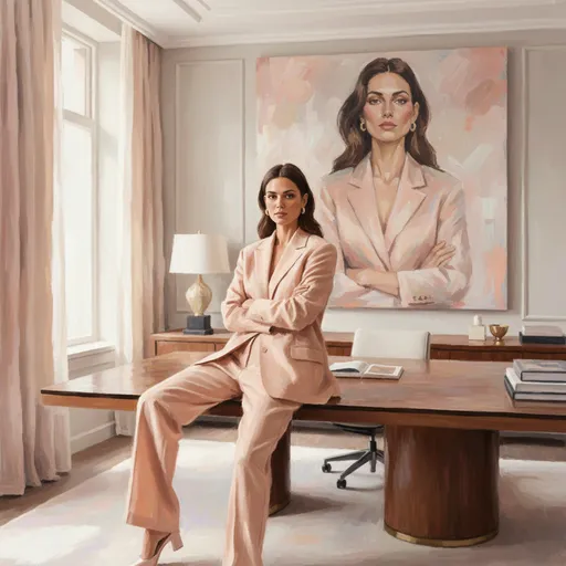 painted with expressive pastel brushstrokes — pink, peach, beige — dynamic, sweeping strokes that create movement.; Create a stylish cinematic scene with a woman sitting confidently on the table in her personal luxury office room.; She wears a loose pastel-toned dress or an oversized soft-colored suit; blending elegance and subtle boldnessThe background features a huge artistic portrait of the same woman, Soft daylight, fashion-editorial mood, clean