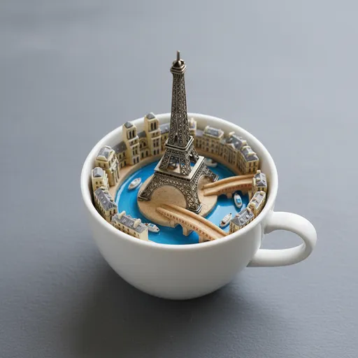 The perspective is top-down, with gentle depth-of-field blur at the cup’s edges, focusing sharply on the Eiffel Tower as the focal point.; Bridges span across a tiny river resembling the Seine that curves through the cup, with miniature boats floating beneath.; Prompt on Nano Banana Pro : White ceramic coffee cup rests on a smooth gray surface, its interior transformed into a miniature version of Paris., Instead of liquid, the cup contains tiny detailed stre