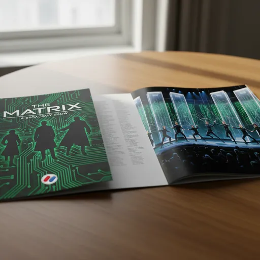 A photo of a programme for The Matrix broadway show, it's professional and well made, glossy, we can see the cover and a page showing a photo of the stage; photorealistic, high detail; natural lighting