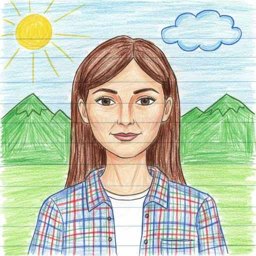 Portrait of a woman, Based on (1:1 facial resemblance), Same hairstyle as reference, Plaid shirt, T-shirt; Green mountains, Blue sky, Bright yellow sun, Blue cloud, Simplistic, amateur landscape; Charmingly amateur, nostalgic; Child's drawing / Naive art, Colored pencil, Lined notebook paper, Vibrant but slightly uneven coloring, simplistic shading, Simplistic, amateur lands