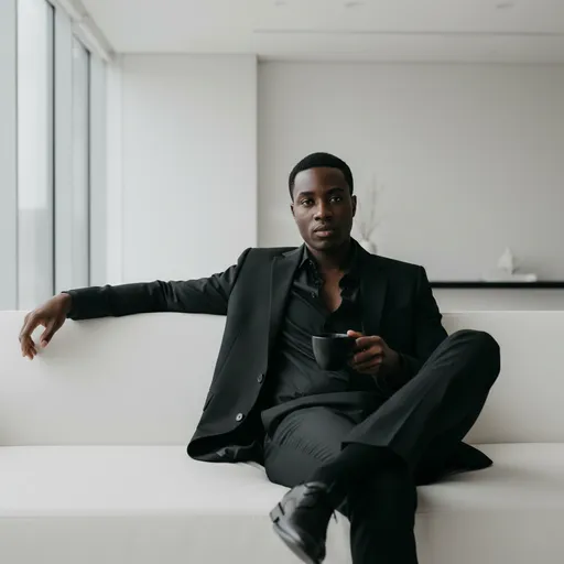 A premium cinematic portrait of a man with natural dark facial features, sitting relaxed on a long modern white sofa in a minimal luxury interior.; His left arm stretches along the backrest, right hand holding a matte black coffee cup, legs crossed confidently.; A premium cinematic portrait of a man with natural dark facial features, sitting relaxed on a long modern white sofa in a minimal luxury interior., Sh; He wears an all-black suit with the shirt slightly open for a stylish formal-casual balance., Soft ambient window light creates gentle shadows without overexposing the skin.
