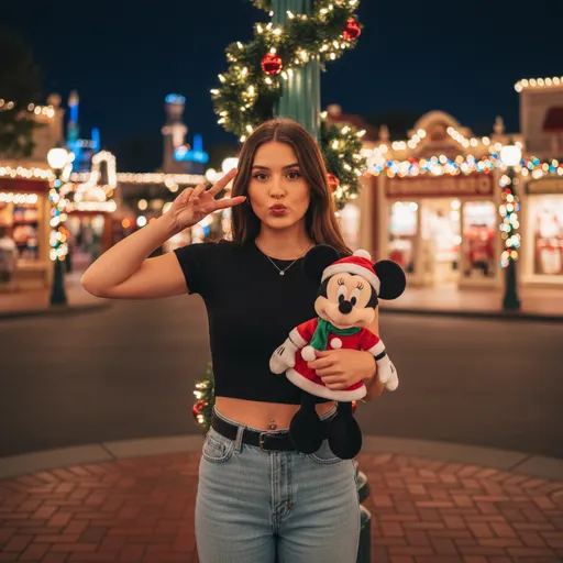 Prompt for Gemini nano banana pro:, Using my reference image., DO NOT CHANGE THE FACE — keep all facial features exactly the same.; A young woman stands in the foreground, centered in the frame., In her left hand, she holds a plush Minnie Mouse doll dressed in a red Santa outfit with white trim and a green scarf; Create a highly detailed, festive nighttime scene at a character merchandise store theme park during Christmas season.; while making a playful peace sign near her face and puckering her lips in a cute kiss pose.; The shot is an eye-level, straight-on medium portrait from the waist up, captured with a Fujifilm professional camera, The overall mood is joyful, whi; using shallow depth of field to keep her in perfect focus while softly blurring the background., The ground is paved brick, and distant bokeh lights from park attractions create a magical atmosphere.; a black crop top revealing a subtle navel piercing, high-waisted light blue jeans with a black belt, Behind her, a classic green lamppost wrapped in Christmas garland, twinkling warm white lights, red