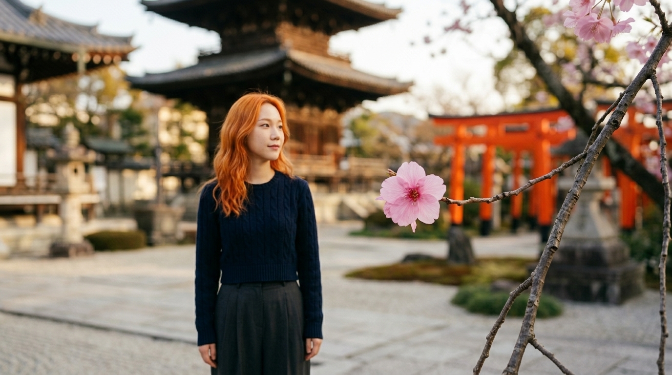 RACK FOCUS — a single cherry blossom in the foreground is sharp, while the subject stands behind it slightly blurred but recognizable. The shifting focus draws the eye between bloom and woman. Poetic.