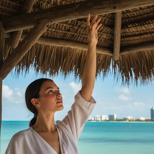 raising one arm upward to touch the wooden roof structure, body angled slightly to the side; tropical beach hut or seaside wooden cabana, blue ocean water, bright sky with scattered clouds, distant city skyline and coastal buildings, wooden beams and thatched roofing above, sunny, warm, re...; fresh, tropical, radiant, sunny, warm, relaxed coastal vibe, tropical vacation portrait, sun-kissed skin, soft natural blush, vibrant coastal colors,; natural outdoor portrait, close-up, slightly low angle, bright natural sunlight with warm highlights on skin, fresh, tropical, radiant, sharp subject,; close-up, slightly low angle; bright natural sunlight with warm highlights on skin