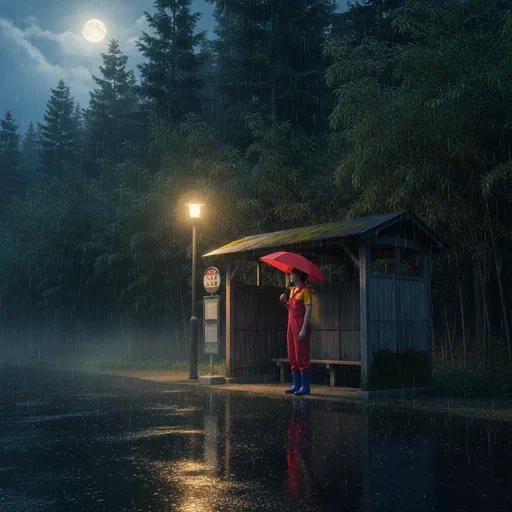 Red jumpsuit, yellow t-shirt, Blue boots, Small red umbrella; Standing, looking to the side, Waiting in the rain; Rural Japanese bus stop, Rainy night, Dense wet forest trees, Aged bus stop sign; Photograph, Ultra-realistic; Wide shot; Dim lamppost, Moon, Realistic rain reflections on wet asphalt