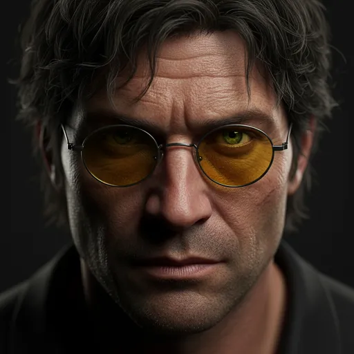 Extreme close-up portrait, Rugged man, 100% real face from reference image (implied, assuming the image provided was the reference), Looking intensely over the rim of small, round, yellow-tinted metal sunglasses, Piercing green eyes, clearly visible and sharp, making direct eye contact, Messy, da...; Extreme close-up portrait, Rugged man, 100% real face from reference image (implied, assuming the image provided was the reference), Looking intensely over the rim of small, round, yellow-tinted me...; Dark and out of focus (bokeh) to keep all attention on the face; Dramatic cinematic lighting (chiaroscuro), Strong contrast, Hard light source hits the center of the face, highlighting the texture of the skin, the b; Messy, dark wavy hair falling slightly onto his forehead, Dramatic cinematic lighting (chiaroscuro), Photorealistic, Unreal Engine 5 render style; Yellow lenses should cast a subtle warm glow on the upper cheeks, 85mm lens, f/1.8 aperture for shallow depth of field; Dramatic cinematic lighting (chiaroscuro), Strong contrast, Hard light source hits the center of the face, highlighting the texture of the skin, the bridge of the nose, and the forehead, Sides of the