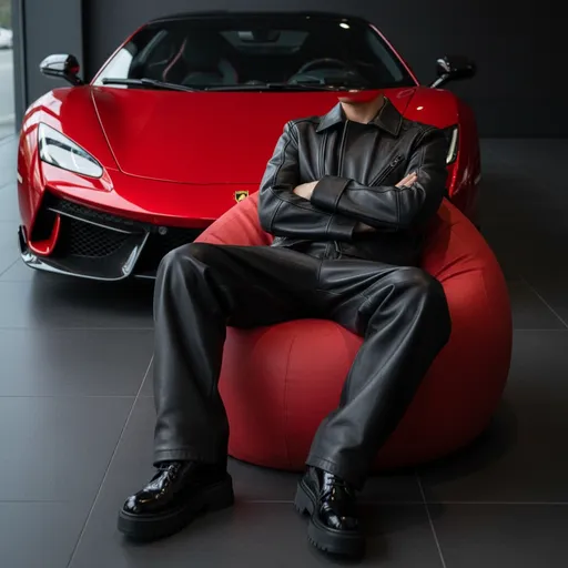 seated slightly off-center on a bright red beanbag chair, must match reference photo with 1000% accuracy, matte black leather jacket with structured seams and folded cuffs, oversized black leather trousers pooling at the ankles, chunky black platform shoes with high-shine surfaces, arms crossed i...; arms crossed in a relaxed, confident pose with subtle reflections emphasizing leather textures; sleek, dimly lit luxury showroom, seated slightly off-center on a bright red beanbag chair, vivid red supercar with angular front bumper, sharp air intakes, and glossy black detailing; natural, authentic, HD look as if photographed with an flagship smartphonecamera; natural, authentic, HD look as if photographed with an flagship smartphonecamera; sculpted hood shifting from deep shadows to bright reflections
