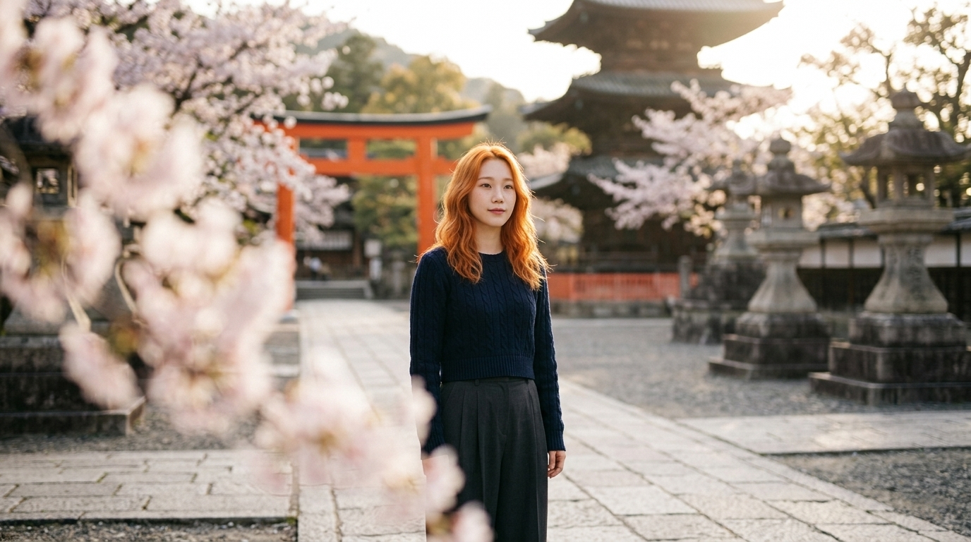 SHALLOW DEPTH OF FIELD — shot at f/1.2, only the subject's face is razor sharp. Cherry blossoms in foreground blur into soft pink shapes. Pagoda in background melts into beautiful creamy bokeh. Extreme subject isolation.