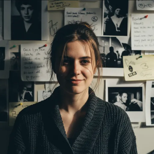 She gives a knowing half-smirk., She’s wearing a charcoal cardigan with texture., The shot feels like a raw indie-movie still — grain-heavy, imperfect, intentional.; Behind her: a cluttered wall of handwritten notes and torn film stills.; A young woman, same face preserved, lit by a harsh on-camera flash from a thrift-store film camera., Her hair is loosely pinned, stray strands shadowing her eyes.