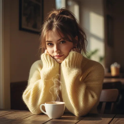 She is wearing a chunky oversized pastel yellow knit sweater., There is a white ceramic coffee mug on the table in the foreground.; Pose: She is leaning forward resting her chin in her hands with her elbows on the table looking directly at the camera with a soft calm expression.; A high-resolution photorealistic portrait of a young woman sitting at a wooden table in a sunlit cafe., High quality 8k soft focus aesthetic; She has long soft brown hair tied back in a high loose ponytail with wispy bangs framing her face., The background is a soft warm-toned blur (bokeh) suggesting a cozy room interior.; Lighting & Atmosphere: Warm golden hour sunlight creates strong shadows and highlights on her face., The lighting is cinematic and cozy.