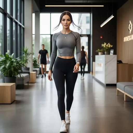 she is wearing the full outfit and accessories exactly as in the attached image 2, follow the outfit completely and precisely as in the image, her hair color same in photo uploaded straight in hair tie bun and few strands each face side flowing gracefully.; Create a hyper-realistic portrait of the woman from the uploaded image, she is walking inside the gym lobby ., Copy the make up on the photo provid