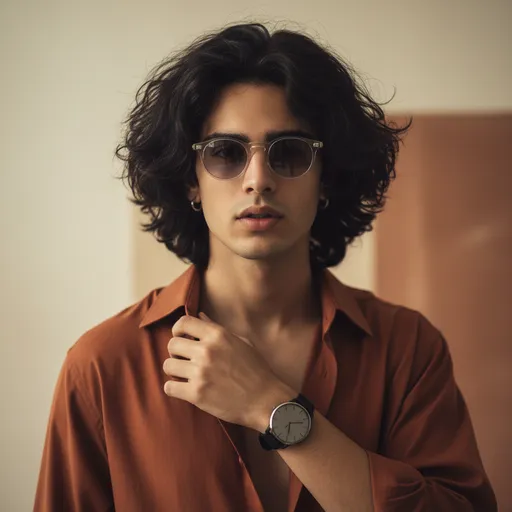 singl accessorized with a watch and a small earring.; create a stylish, modern portrait of a young man with voluminous dark hair, wearing a loose-fitting rust color shirt Top button down., Cinematic light; The background is soft, minimal, and subtly blurred to emphasize a contemporary fashion-forward vifac Transparent sunglasses.
