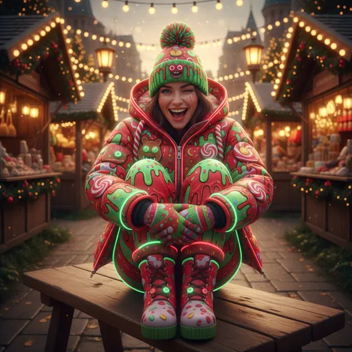 the person from the reference photo ONLY, Do NOT use any traits, gender, clothing or body features from previous prompts. Use ONLY the face, body type, and identity from the reference photo., sitting on a wooden market bench with knees pulled up and arms wrapped around them, giving a cheerful win...; sitting on a wooden market bench with knees pulled up and arms wrapped around them, giving a cheerful wink; outdoor Christmas market, twinkle lights, wooden stalls, warm hanging lanterns; cozy, festive, romantic, warm, chaotic, holiday-playful, surreal; winter outfit inspired by reference, adapted for Christmas market, maximalist Christmas sweets-monster pop-art, flat neon holiday palette (red, green,; low-to-mid angle, slight wide-angle with warm bloom, subject centered among Christmas lights; warm golden fairy-light glow, cozy, festive, romantic