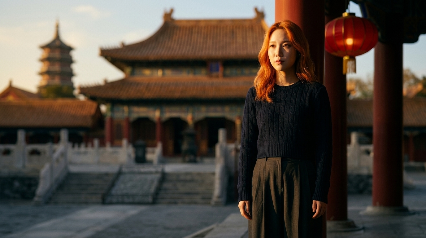 SPLIT LIGHTING — exactly half the subject's face is in warm sunlight from the left, the other half in deep shadow. Sharp vertical divide down the subject's nose. Red lanterns glow in the dark side. Mysterious duality.
