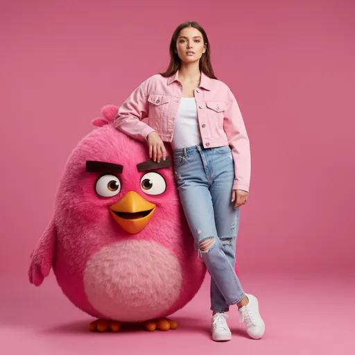A stylish young woman with the same face as the reference photo., standing with one arm resting casually on a giant 3D-rendered Angry Birds 'Pink' character, natural, confident, casual fashion look; standing with one arm resting casually on a giant 3D-rendered Angry Birds 'Pink' character, the woman’s arm rests on the character as if posing together; seamless solid vibrant light pink backdrop, professional photo studio, soft evenly diffused studio lighting with clean highlights and minimal shadows; modern fashion photography, playful, bright, stylish, hyperrealistic skin texture, sharp fabric details, accurate lighting reflections on 3D character; hyper-realistic, high-detail, professional fashion photoshoot, clean, glossy, cartoon-accurate but ultra-detailed, modern fashion photography; soft evenly diffused studio lighting with clean highlights and minimal shadows