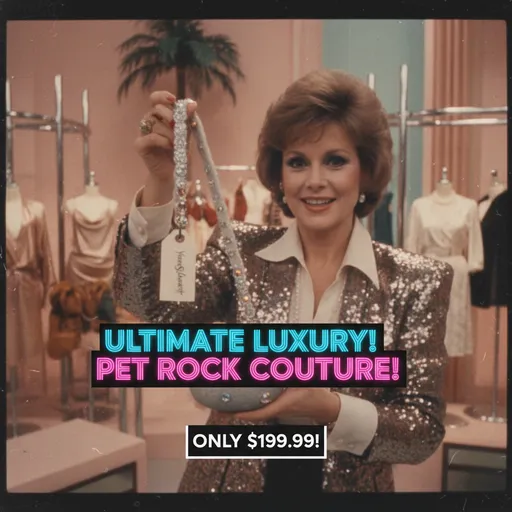 Still from a Shopping designer brand VHS tape from 1986, where someone is selling the most useless trinket ever invented; photorealistic, high detail; natural lighting