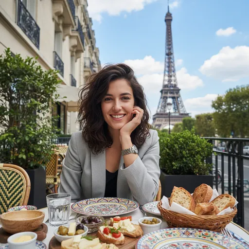 The table is set with colorful patterned plates, bread, appetizers, and a glass of water.; A young woman sitting at an outdoor café table in a Paris setting, with the Eiffel Tower visible in the background under a bright blue sky with soft clouds., The surroundings include lush green foliag; She has dark brown wavy messy hair.; Shot in natural daylight, high-resolution, 35mm lens, f/2.8, crisp details, vibrant colors, shallow depth of field, lifestyle photography style with a warm and cheerful ambiance.; She wears a light gray stylish jacket and a metallic wristwatch, posing with a relaxed smile and her hand near her face.