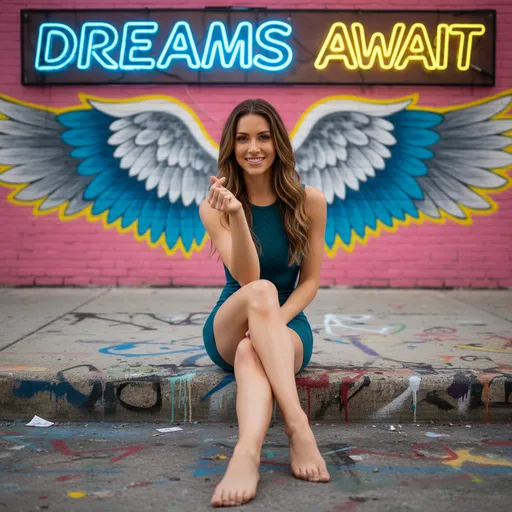 Their legs are long and slender, with defined calves., Clothing and Footwear: Whenever a flat lay image is available alongside the reference image, priority should be given to dressing the subject in the clothing shown in the flat l; with one leg crossed over the other and looking directly at the camera., The ground is a concrete sidewalk with colorful graffiti and subtle paint marks.; Setting: The setting is an urban street with a vibrant pink mural in the background, depicting a pair of open angel wings in shades of blue, white, and gray, with yellow accents., Above the mural, den; They have a toned, flat abdomen., The garment is fitted, accentuating their slender and athletic figure, with narrow shoulders and toned arms.; Portrait: A medium-length portrait of the subject (with the same face and hairstyle as the submitted image; Composition: The camera is positioned in a medium shot, slightly below the subject's eye level, creating a magical depth of field and subtle reflections.; Their right hand is raised near their face, forming a heart shape with the fingers curled inwards, suggesting a heart sign and conveying a warm and friendly feeling., When this is not available, dress