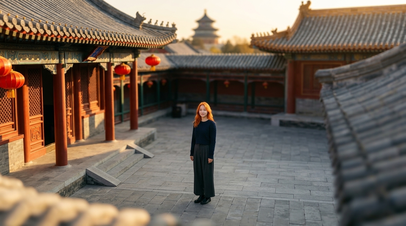 TILT-SHIFT MINIATURE EFFECT — bird's eye view of the Chinese courtyard with extreme selective focus. Only a thin horizontal band where the subject stands is sharp. Everything above and below blurs dramatically. Looks like a miniature model.