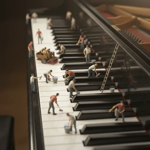tilt-shift photo of a grand piano keyboard, side view from the left looking along the keys to the right; tilt-shift photo of a grand piano keyboard, side view from the left looking along the keys to the right; shallow depth of field, tiny human figures cleaning the piano keys with brushes, cloths, and buckets; whimsical and surreal scene, soft lighting, hyper-detailed, high realism --ar 3:2