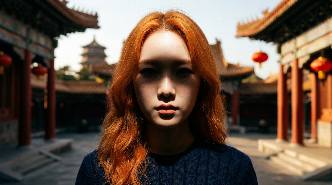TOP LIGHTING / HATCHET LIGHT CLOSE-UP PORTRAIT — HEAD-AND-SHOULDERS CROP, face fills 60% of the frame. A single HARD light source positioned DIRECTLY ABOVE her head pointing STRAIGHT DOWN. Her forehead is brightly lit, but her EYES are in DEEP SHADOW — the brow ridge casts a hard shadow over her eye sockets, leaving the eyes hidden in darkness. Her nose casts a long hard shadow down onto her upper lip. Her chin is also in deep shadow beneath her lower lip. High-contrast film noir interrogation feel. Dark background. Dramatic, mysterious, almost sinister mood.