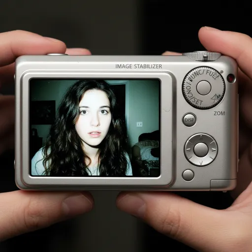 Use facial feature of attached photo., The camera body surrounds the image with its buttons, dials, and textured surface visible, including the FUNC/SET wheel, DISP button, and the “IMAGE STABILIZER” label along the side., No text, no logos inside the photo preview itself.; The mood is candid, raw, nostalgic, and reminiscent of early 2000s digital camera snapshots.; A close-up shot of a young woman displayed on the screen of a compact Canon digital camera., Lens: equivalent to 28–35mm; The photo on the screen shows the woman indoors at night, illuminated by a bright built-in flash that creates sharp highlights on her face and hair., She has long dark hair falling across part of her