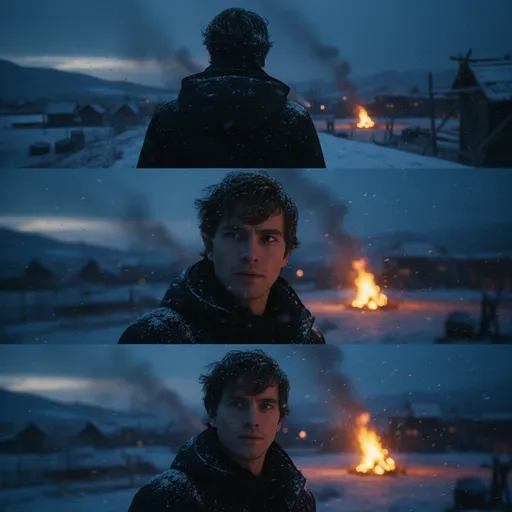 Use provided user face, Male model, Black jacket, Dark, slightly tousled by wind, dusted with snow, Same character, same clothing across all panels, Upper-body back view facing the distance under a deep blue sky, Cinematic portrait in same setting (implied), Cinematic portrait in same setting (im...; Smoky village landscape, Open village area, Cold, windy, snowy, Deep blue evening sky, warm glow from campfire; Cold, windy, snowy; Portrait Collage, Ultra-realistic, Cinematic; Vertical stack, Horizontal panels; Deep blue evening sky, warm glow from campfire
