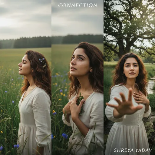 "Visual_Concept": {, Signature: Shreya Yadav; portraying a woman in a lush green meadow with a contemplative, natural, and emotional tone.",, "Theme": "Connection between human emotion and nature"; "Objective": "Generate a cinematic 3-frame collage using the facial features of the attached photo as reference, "Tone": "Cinematic realism blending r; "Lighting": "Soft, diffused natural daylight under overcast conditions",