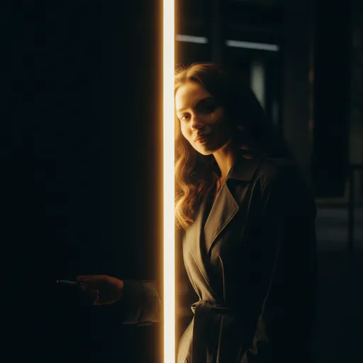 A woman leaning slightly toward a softly glowing vertical light bar, half of her face illuminated in a warm haze while the other half fades into a pitch-black background.; The scene has a modern noir aesthetic with minimal lighting and cinematic atmosphere.; A woman leaning slightly toward a softly glowing vertical light bar, half of her face illuminated in a warm haze while the other half fades into a pitch-black background., Her posture is relaxed, her