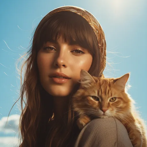 A young woman in an HD editorial fashion portrait, young adult, soft, warm, intimate expression, fluffy orange cat relaxing on her shoulder; bright blue sky, vibrant, summery, high-contrast, strong natural sunlight; vibrant, summery, high-contrast; long layered cut with loose wind-blown strands and dark bangs under the headscarf, high-fashion, editorial fashion photography; amber-tinted, editorial fashion photography, close-up portrait, intimate, warm, photorealistic; intense backlit sunlight with flares, dreamy high-contrast summer aesthetic, strong natural sunlight