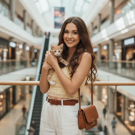 A young woman with long, wavy brown hair is smiling directly at the camera.; She is holding a ginger and white kitten in her left arm.; The background is a softly blurred indoor shopping mall with multiple levels, escalators, and retail storefronts visible.; She is wearing a light yellow lace-trimmed crop top, white high-waisted pants with a brown belt, and carrying a small brown shoulder bag.