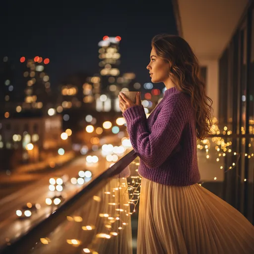A young woman with long brown hair blowing in the wind, seen in profile., A purple knit sweater and a beige pleated skirt., Holding a mug with both hands and looking out at the view., A purple knit sweater and a beige pleated skirt.; Holding a mug with both hands and looking out at the view.; A balcony at night., A blurred city skyline with numerous warm bokeh lights from buildings and traffic. A string of warm fairy lights is draped on the glass railing., Contemplative, serene, and pea...; Contemplative, serene, and peaceful.; A photograph.