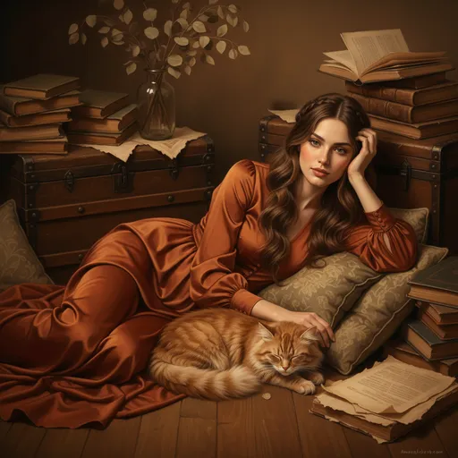 A young woman with long wavy brown hair styled with two thin front braids, lying on her side in an elegant vintage setting., reclining on her side, head supported by one hand, body slightly angled toward the camera, soft, calm, and slightly dreamy, rust-orange satin long-sleeve dress, pictorial p...; reclining on her side, head supported by one hand, body slightly angled toward the camera, lying comfortably in front of the woman; warm vintage interior, old wooden chests, stacks of aged, yellowed books, glass vase with dried eucalyptus branches, wooden floor with warm tones, soft warm studio lighting with gentle shadows; vintage, elegant, artistic, warm browns, golds, and muted neutrals, rich fabrics, aged paper, brushed wood, soft cat fur, editorial, painterly, cinema; ultra-detailed, 8k, cinematic lighting, editorial, painterly, cinematic; soft warm studio lighting with gentle shadows
